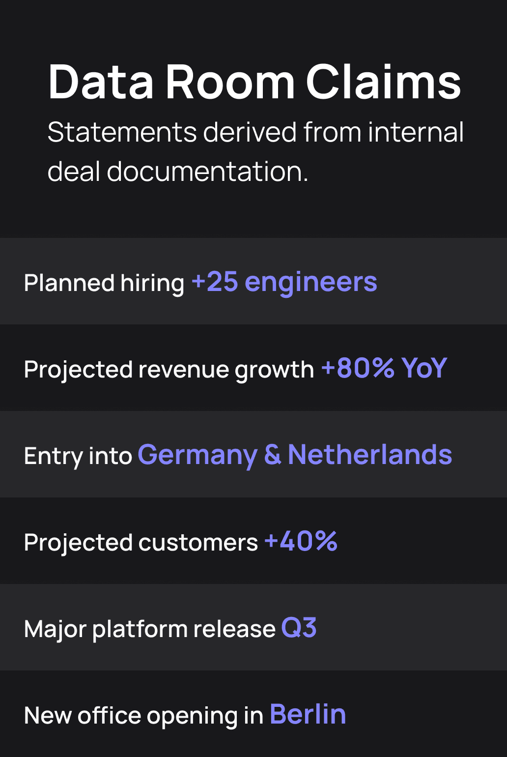 Coddect augments internal deal documentation with external intelligence sources to detect inconsistencies, uncover hidden risks and provide a more complete view of the target company.