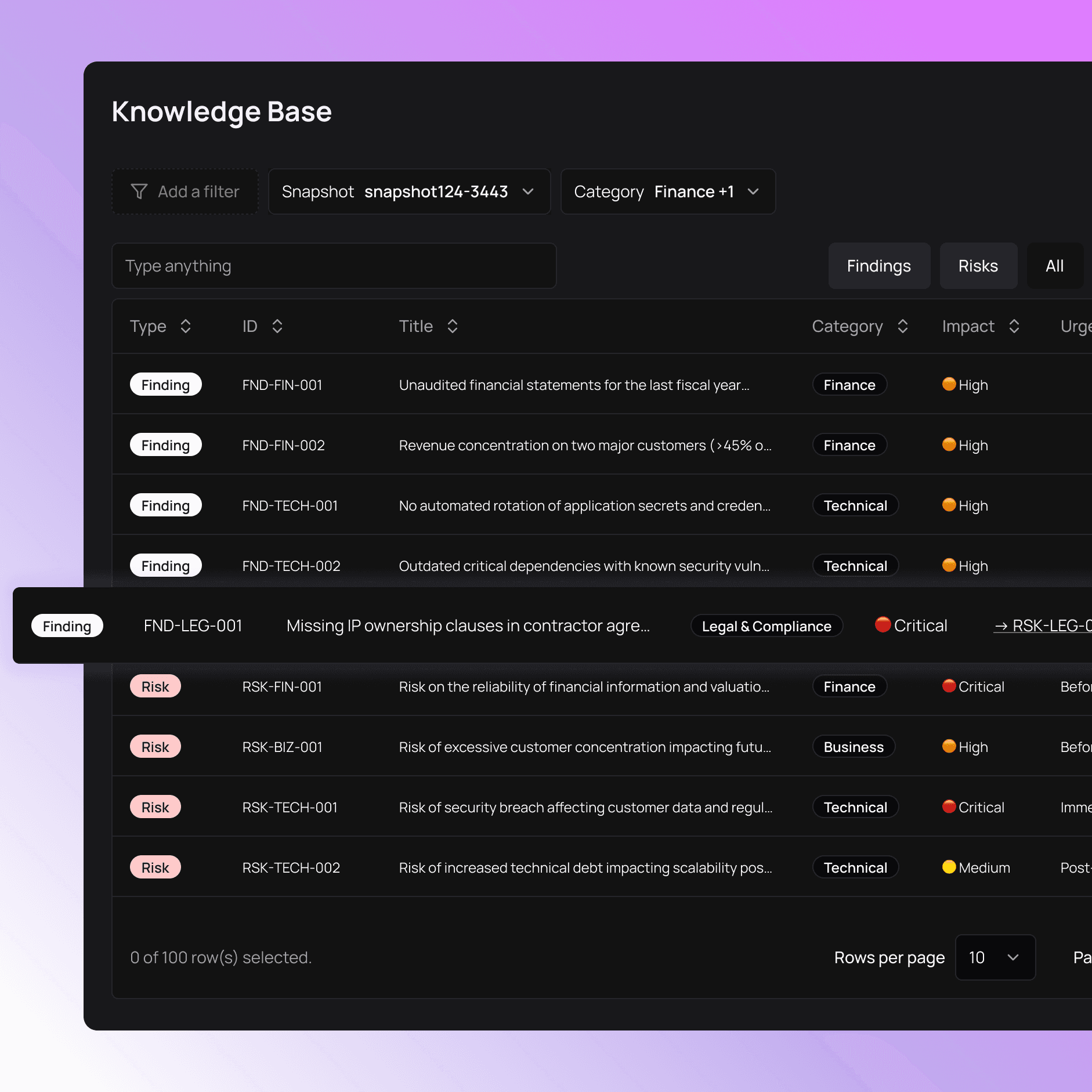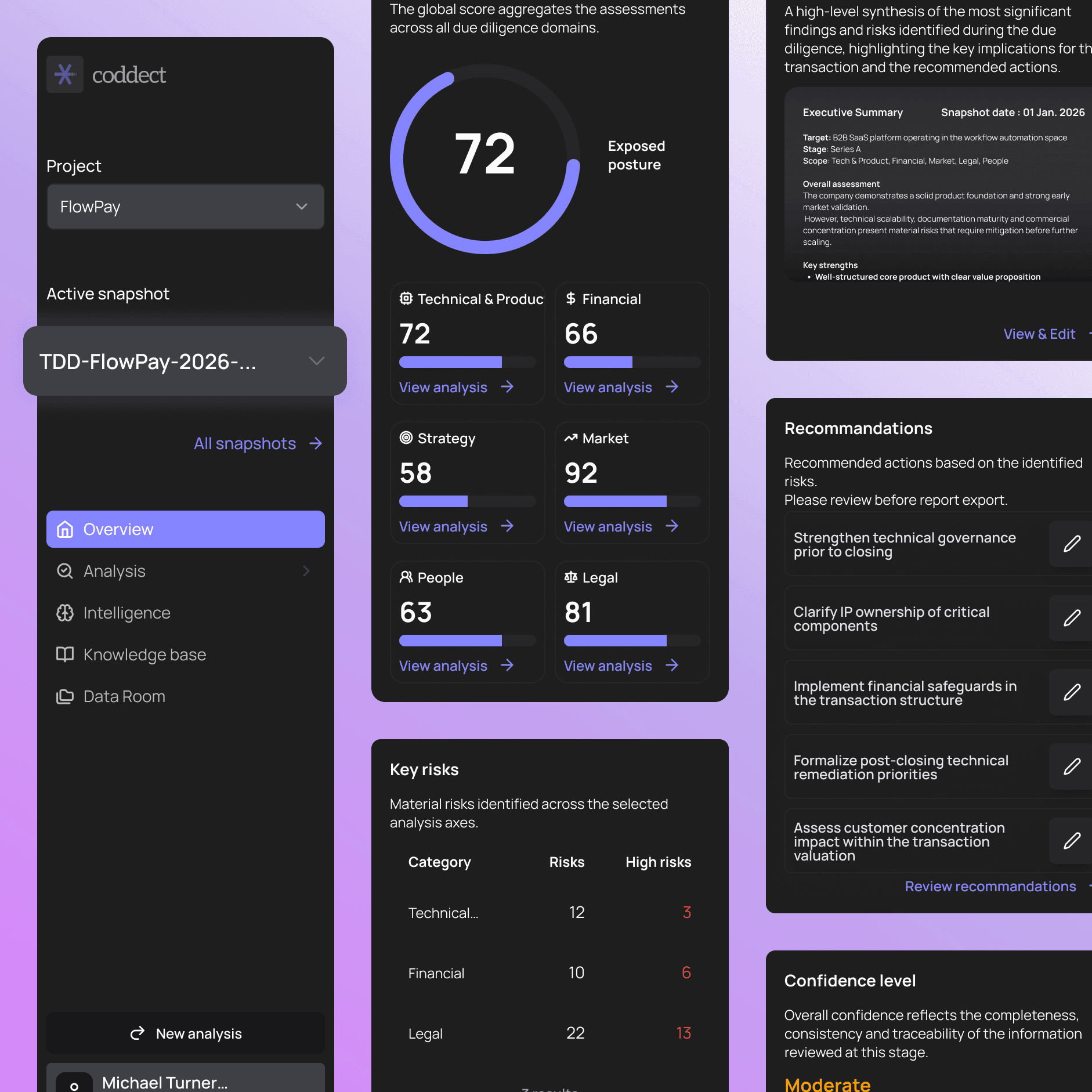 Coddect analyzes your documentation, identifies potential risks and surfaces gaps before entering a transaction.