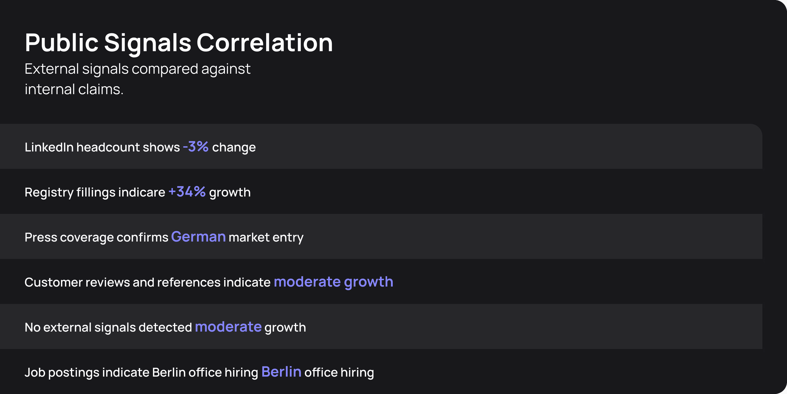 Integrate market signals and competitive intelligence into the due diligence analysis.
