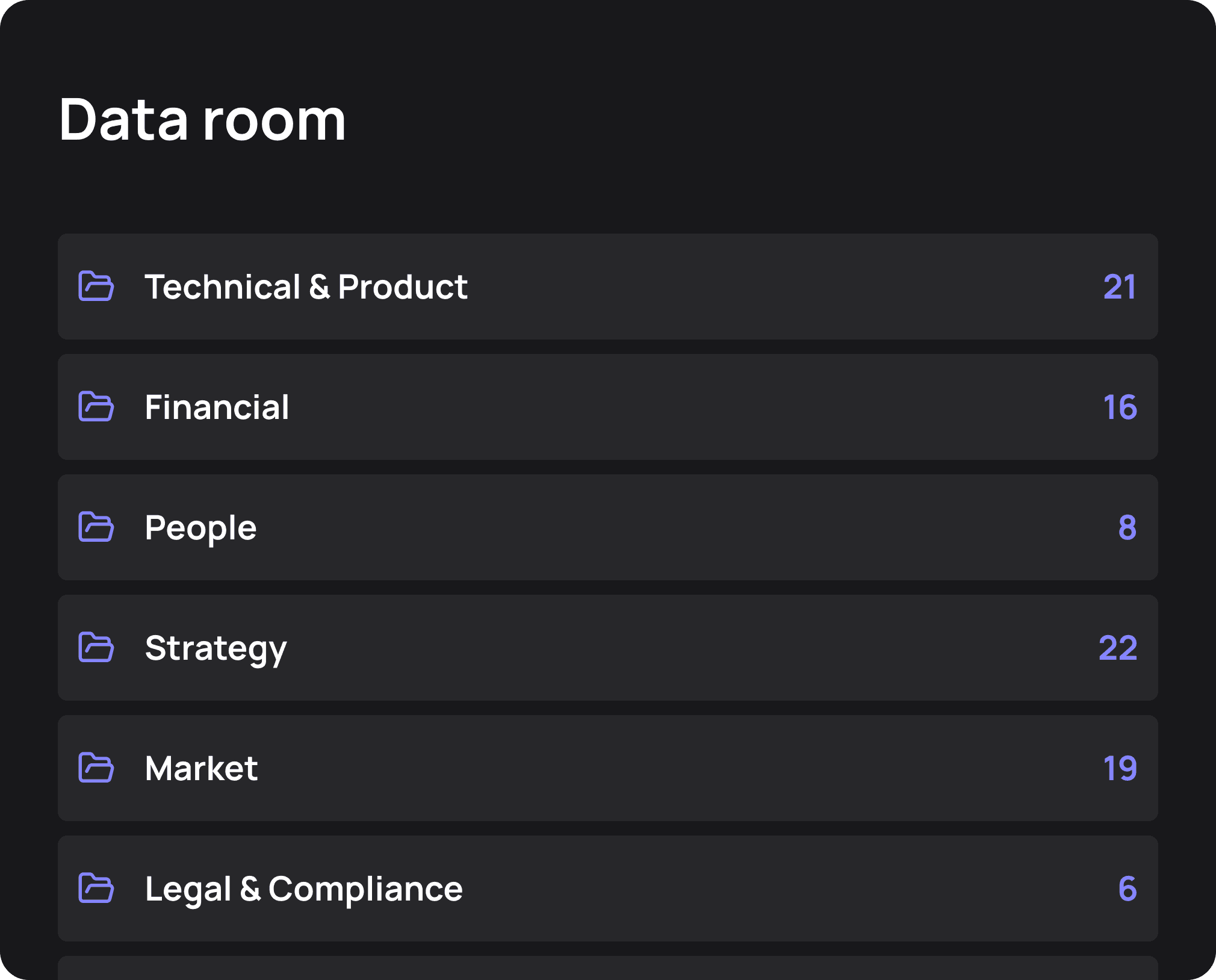 Ingest data rooms, repositories, uploads, and public sources into a unified analysis model.